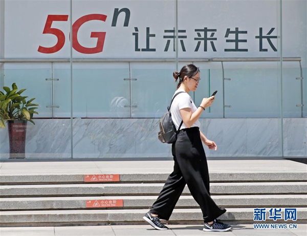6月3日,在北京西單,一名女子從一塊5G廣告牌前走過。新華社記者 才揚(yáng) 攝