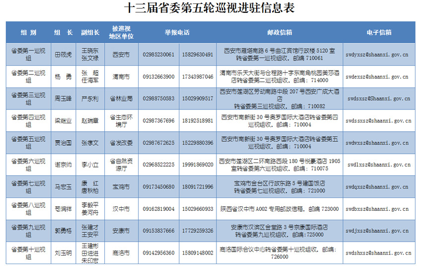 根據(jù)安排,省委巡視組將在被巡視地區(qū)、單位工作1個月左右。巡視期間設值班電話、郵政信箱、電子郵箱等,巡視組受理信訪時間截止到2019年6月30日。省紀委監(jiān)委信訪舉報受理電話(029—12388)、信箱(西安市雁塔區(qū)雁塔路南段十號陜西省紀委監(jiān)委信訪室)和網(wǎng)上舉報窗口(http://shaanxi.12388.gov.cn),同步受理涉及秦嶺生態(tài)環(huán)境保護的信訪舉報。根據(jù)秦嶺生態(tài)環(huán)境保護專項巡視工作要求,省委巡視組主要受理反映被巡視地區(qū)和單位秦嶺生態(tài)環(huán)境保護方面的問題和線索。對不屬于這次專項巡視受理范圍的信訪問題反映,將按規(guī)定轉交被巡視地區(qū)或單位和有關部門認真處理。