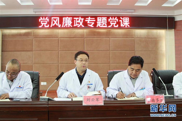 這是來(lái)自北京的援青干部劉云軍(中)在黨風(fēng)廉政專題黨課上(資料照片)。新華社發(fā)