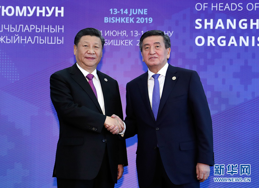 6月14日,國家主席習近平在吉爾吉斯斯坦首都比什凱克出席上海合作組織成員國元首理事會第十九次會議并發(fā)表重要講話。這是習近平抵達阿拉爾恰國賓館會議中心大廳,受到吉爾吉斯斯坦總統(tǒng)熱恩別科夫熱情迎接。 新華社記者 丁林 攝