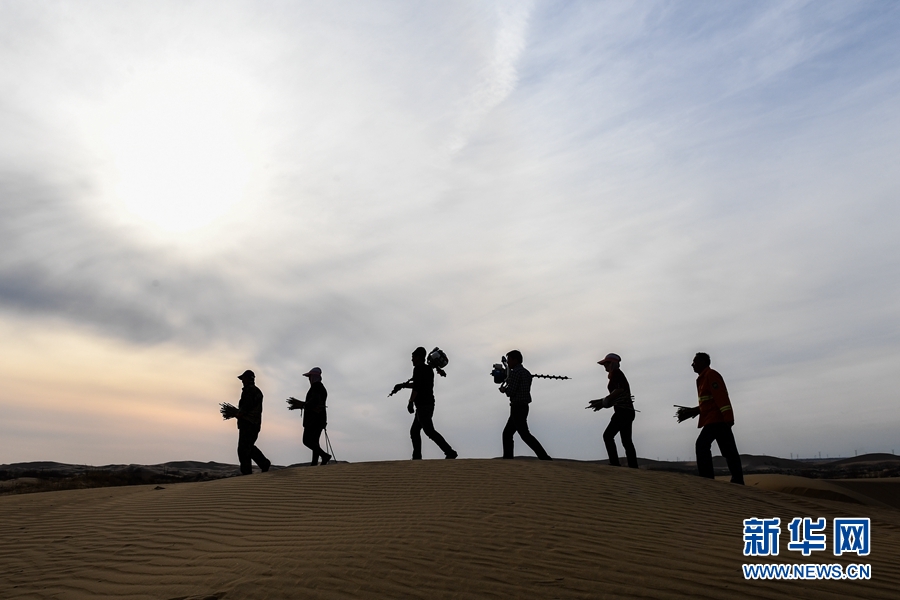 4月1日,在內(nèi)蒙古鄂爾多斯市達(dá)拉特旗銀肯塔拉的沙漠中,治沙工人前往一處種植點(diǎn)。新華社記者 劉磊 攝