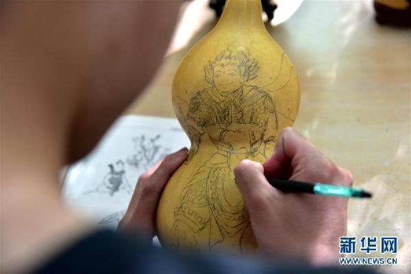 午后陽光和煦,聽障生創(chuàng)新創(chuàng)業(yè)工作室里,來自貴州的徐崇瑞手持鉛筆,在一個嶄新的葫蘆上勾勒年畫,筆法細膩,有條不紊。身后的書架上整齊擺放著他們制作的葫蘆烙畫、手工皮包、糧食鑲嵌畫等作品。