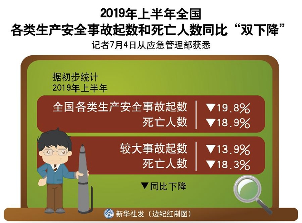 新華社北京7月4日電(記者魏玉坤、葉昊鳴)記者4日從應急管理部獲悉,據(jù)初步統(tǒng)計,今年上半年,全國各類生產(chǎn)安全事故起數(shù)和死亡人數(shù)同比分別下降19.8%和18.9%,較大事故起數(shù)和死亡人數(shù)同比分別下降13.9%和18.3%。