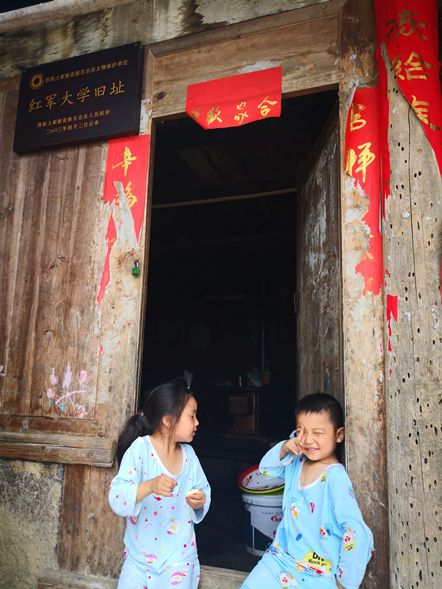 告別了土地廟,沿著紅軍街繼續(xù)東行,上一道坡來到紅軍大學(xué)遺址。這座普通的民房雖然掛著文物的標(biāo)識,如今還有人家居住在此。一個4歲的小男孩和他6歲的姐姐坐在門檻上看著我們,小女孩有點害羞,小男孩說話干脆利落。我倆有了如下對話: