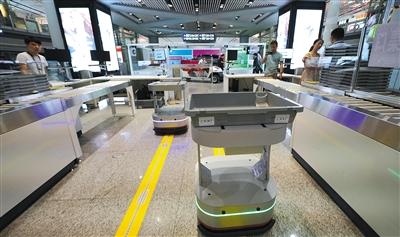 T3航站樓,小機(jī)器人自動(dòng)將需要復(fù)檢的行李運(yùn)送回安檢口。