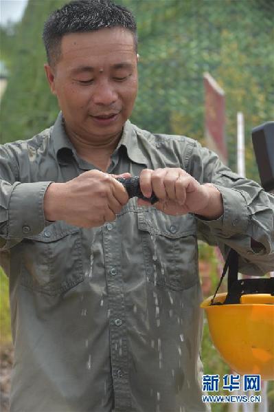 電工胡和鵬在擰被汗水浸透的發(fā)帶(7月30日攝)。新華社記者 譚元斌 攝
