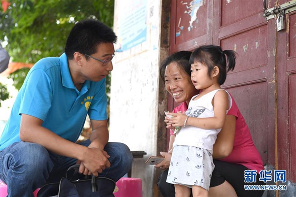 楊杰興(左)在廣西樂業(yè)縣百坭村向村民了解孩子讀幼兒園的情況(8月1日攝)。新華社記者 周華 攝