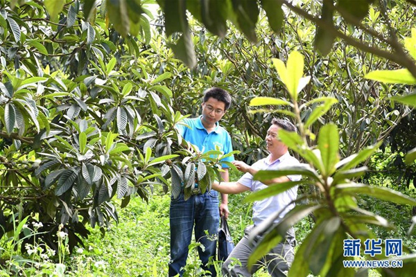 楊杰興(左)在廣西樂業(yè)縣百坭村實地了解村里枇杷產(chǎn)業(yè)發(fā)展情況(8月1日攝)。新華社記者 周華 攝