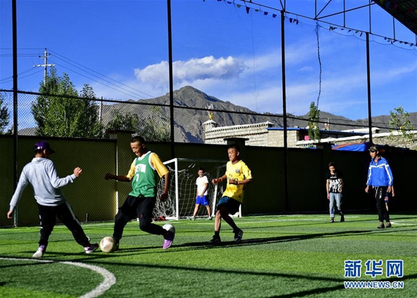 孩子們?cè)谏侥鲜袧僧?dāng)鎮(zhèn)贊堂社區(qū)操場(chǎng)踢足球(7月31日攝)。新華社記者 張汝鋒 攝