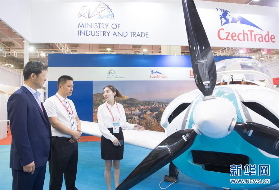 6月8日,在浙江寧波舉行的首屆中國-中東歐國家博覽會上,一名展商(右)在介紹捷克生產(chǎn)的一款輕型飛機。新華社記者 翁忻旸 攝