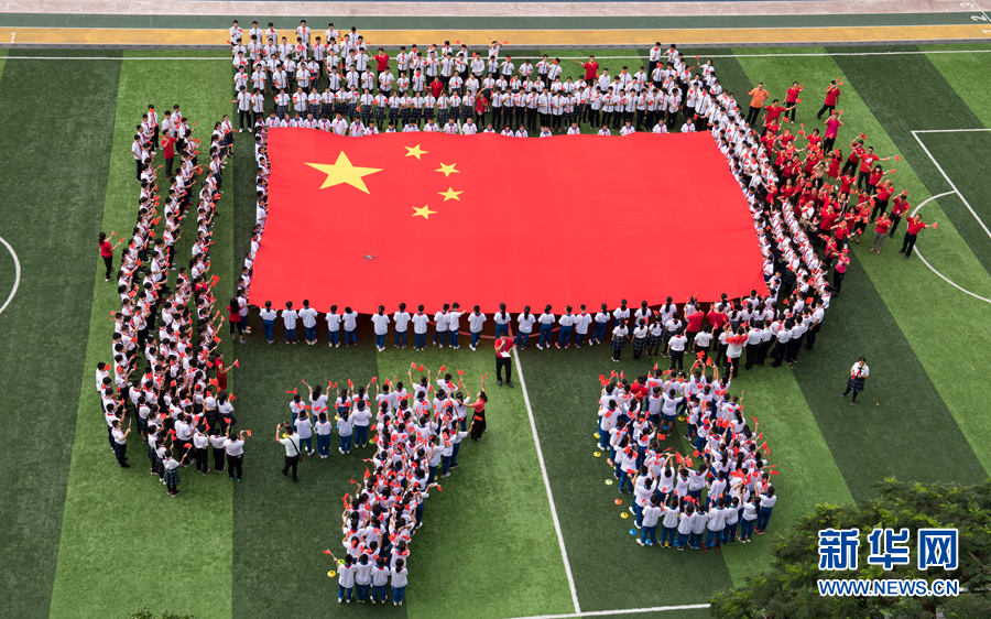 一面巨幅國(guó)旗在廣州市陳嘉庚紀(jì)念中學(xué)綠茵操場(chǎng)上格外引人注目(9月1日攝)。新華社發(fā)