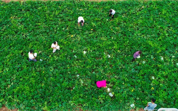 2019年7月7日,河北故城縣建國(guó)鎮(zhèn)姜圈村蔬菜基地,種植戶在采摘冬瓜。(新華社記者李曉果 攝)