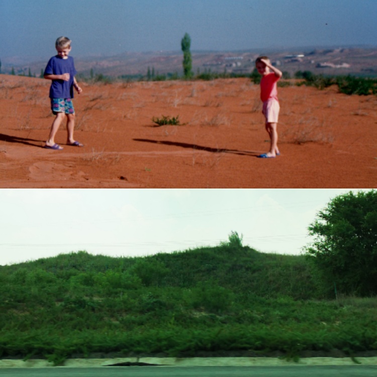 上圖:1994年拍攝的中國西部沙漠;下圖:2019年拍攝的同一地點。(潘維廉供圖)