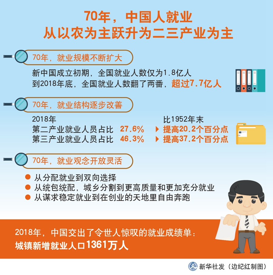 新華社北京9月24日電(記者葉昊鳴)從新中國成立之初大多數勞動者以農為主,到2018年第二、三產業(yè)就業(yè)人員占比超七成,服務業(yè)占主導的現(xiàn)代就業(yè)模式逐步形成,并日漸成為推動我國經濟社會發(fā)展的重要力量。