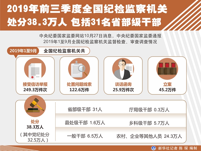 新華社北京10月27日電(記者朱基釵)中央紀(jì)委國(guó)家監(jiān)委網(wǎng)站27日消息,中央紀(jì)委國(guó)家監(jiān)委通報(bào)2019年1至9月全國(guó)紀(jì)檢監(jiān)察機(jī)關(guān)監(jiān)督檢查、審查調(diào)查情況。2019年1至9月,全國(guó)紀(jì)檢監(jiān)察機(jī)關(guān)共接受信訪(fǎng)舉報(bào)249.3萬(wàn)件次,立案45.2萬(wàn)件,處分38.3萬(wàn)人,包括省部級(jí)干部31人,廳局級(jí)干部0.3萬(wàn)人。