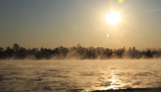 據(jù)分析,“水煮黃河”景觀是由于河面上蒸發(fā)的水汽遇冷凝結(jié)為小水珠,形成一層霧氣后籠罩水面的自然現(xiàn)象。一般在黃河封河之前,在較低的水溫、氣溫和較高的濕度條件下才會出現(xiàn)“水煮黃河”景觀。這種現(xiàn)象一般出現(xiàn)在7點(diǎn)30分到9點(diǎn)30分之間,隨著太陽逐漸升高,霧氣就會散去。