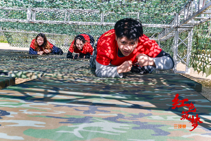 上午九時,一支隊伍正合力將長繩和70面國旗串聯(lián)懸掛至旗海中,讓人聯(lián)想起第一面五星紅旗在開國大典廣場上飄揚的場景;另一支隊伍的幾位隊員正用PVC管作為連接,合力吹氣將5個氫氣球吹爆,這是在通過游戲的形式致敬1967年的第一顆氫彈爆炸成功;還有一群隊員穿著救生衣、膠鞋扛著自己的隊友穿越洪水區(qū)、獨木橋區(qū)、沼澤地區(qū),還原98 年抗洪搶險、5.12抗震救災(zāi)的場景……