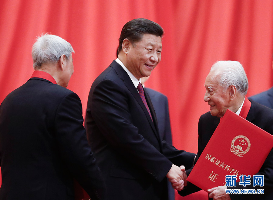 上午10時30分,大會在雄壯的國歌聲中開始。在熱烈的掌聲中,中共中央總書記、國家主席、中央軍委主席習(xí)近平首先向獲得2019年度國家最高科學(xué)技術(shù)獎的原中國船舶重工集團公司第七一九研究所黃旭華院士和中國科學(xué)院大氣物理研究所曾慶存院士頒發(fā)獎?wù)?、證書,同他們熱情握手表示祝賀,并請他們到主席臺就座。隨后,習(xí)近平等黨和國家領(lǐng)導(dǎo)人同兩位最高獎獲得者一道,為獲得國家自然科學(xué)獎、國家技術(shù)發(fā)明獎、國家科學(xué)技術(shù)進步獎和中華人民共和國國際科學(xué)技術(shù)合作獎的代表頒發(fā)證書。