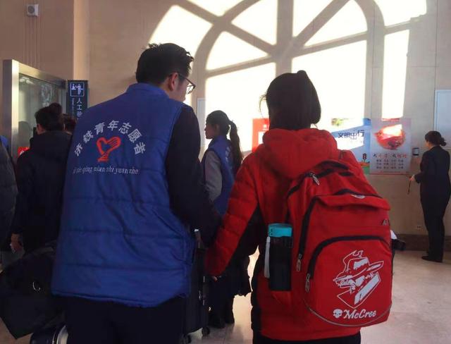 春運(yùn)首日,青島職業(yè)技術(shù)學(xué)院在青島站協(xié)助青島盲校的盲童們踏上回家路。