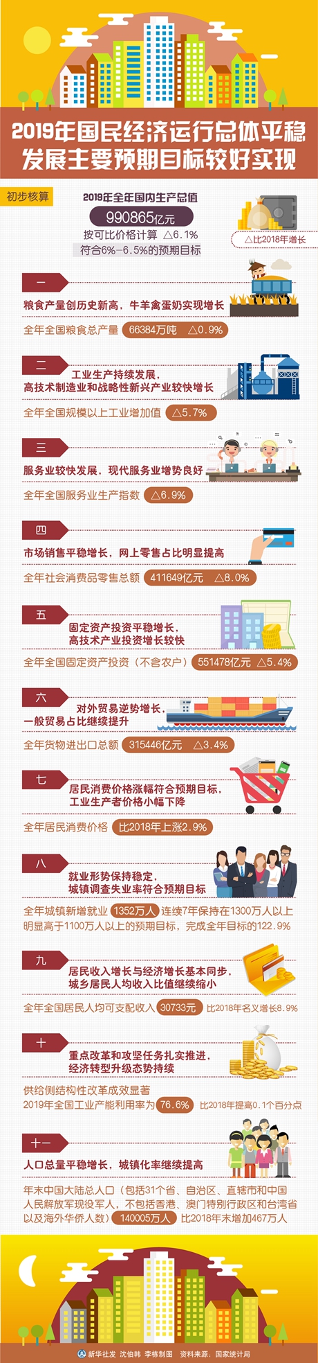 經(jīng)濟(jì)總量接近100萬億元、人均國內(nèi)生產(chǎn)總值突破1萬美元,國家統(tǒng)計(jì)局17日發(fā)布的2019年中國經(jīng)濟(jì)成績單,凸顯中國經(jīng)濟(jì)里程碑式的新跨越。