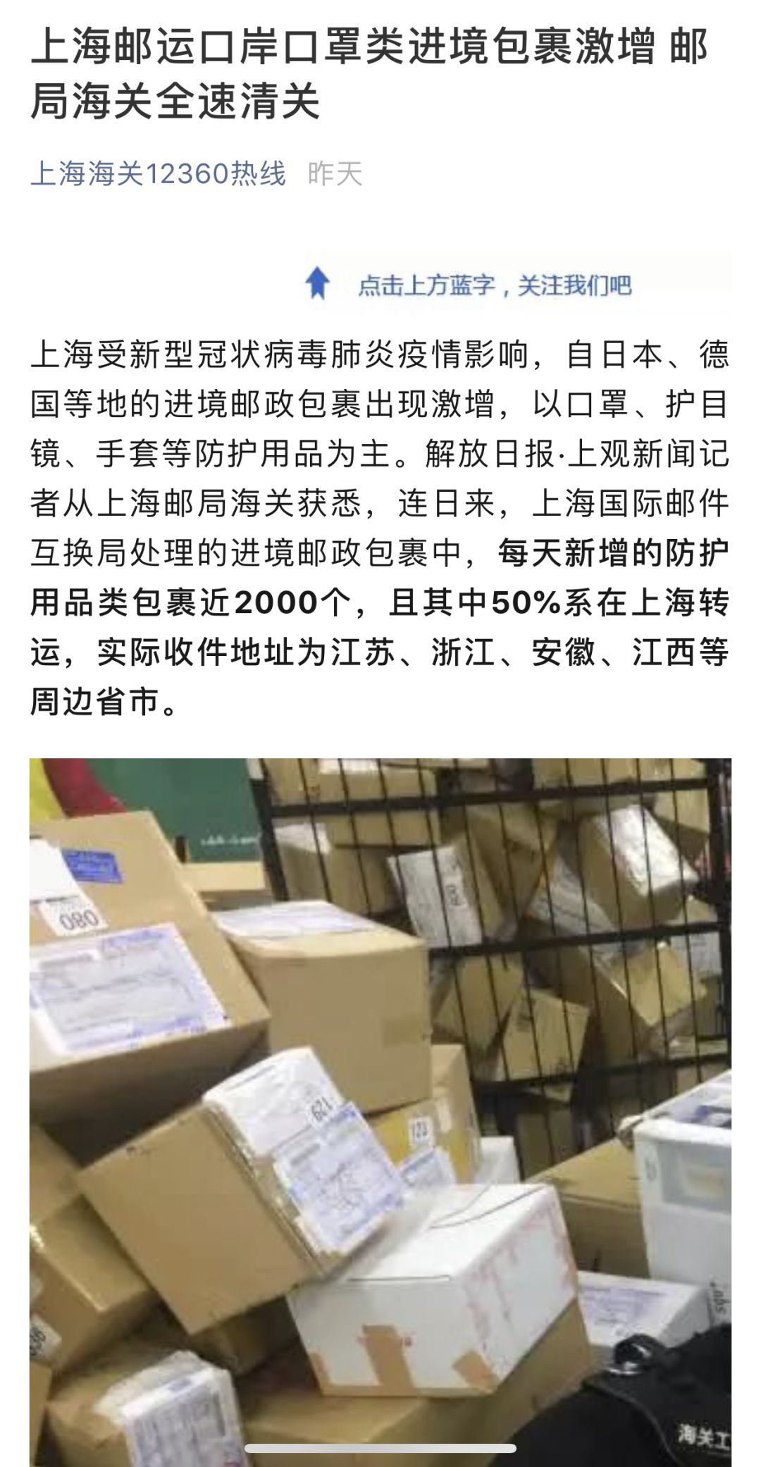 (上海郵運口岸口罩類進(jìn)境包裹激增 郵局海關(guān)全速清關(guān))