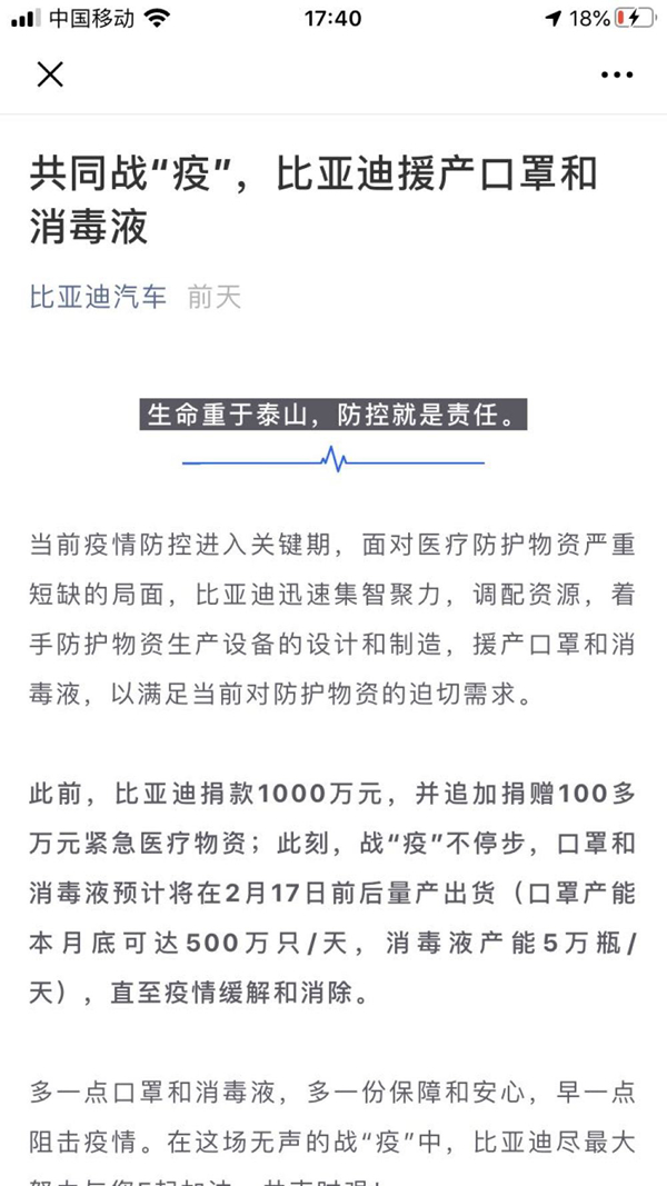 2月8日,“比亞迪汽車”微信號(hào)一篇《共同戰(zhàn)“疫”,比亞迪援產(chǎn)口罩和消毒液》引發(fā)網(wǎng)友關(guān)注,文章稱,比亞迪將在2月17日前后預(yù)計(jì)量產(chǎn)出貨口罩和消毒液(口罩產(chǎn)能本月底可達(dá)500萬只/天,消毒液產(chǎn)能5萬瓶/天),直至疫情緩解和消除。