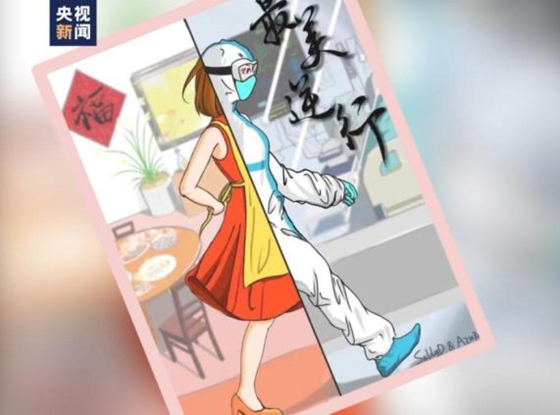 設(shè)計(jì)師董思喬的母親,是北京大學(xué)人民醫(yī)院的一名醫(yī)務(wù)工作者。在董思喬七歲那年,正逢非典暴發(fā),她的母親堅(jiān)守崗位留在醫(yī)院救治患者。十七年后,新冠肺炎來襲,她看到很多醫(yī)務(wù)工作者也像當(dāng)年她的母親一樣在最危險(xiǎn)的地方戰(zhàn)斗,義無反顧,馳援武漢。于是,她拿出畫筆畫出她心中醫(yī)務(wù)工作者們最美的樣子:“身后,是飄香的飯菜,是溫馨的家;面前,是防疫一線,是需要救治的患者。逆行者們,愿你們平安歸來。”