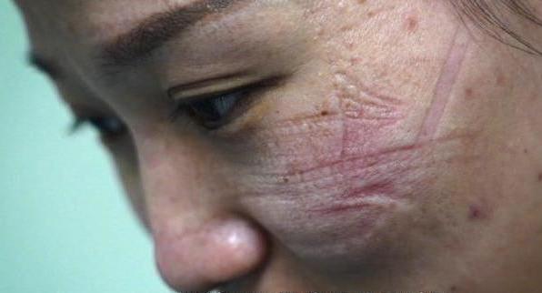 笑對(duì)臉上令人心疼的勒痕