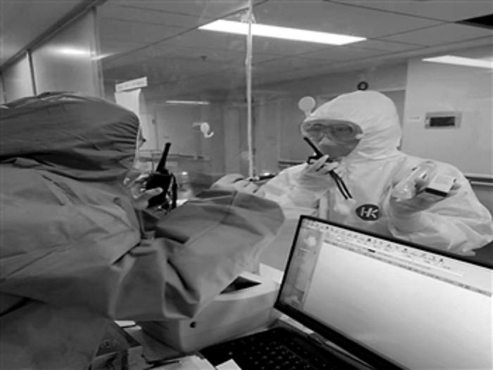 兩位醫(yī)護人員隔著玻璃用對講機交流。