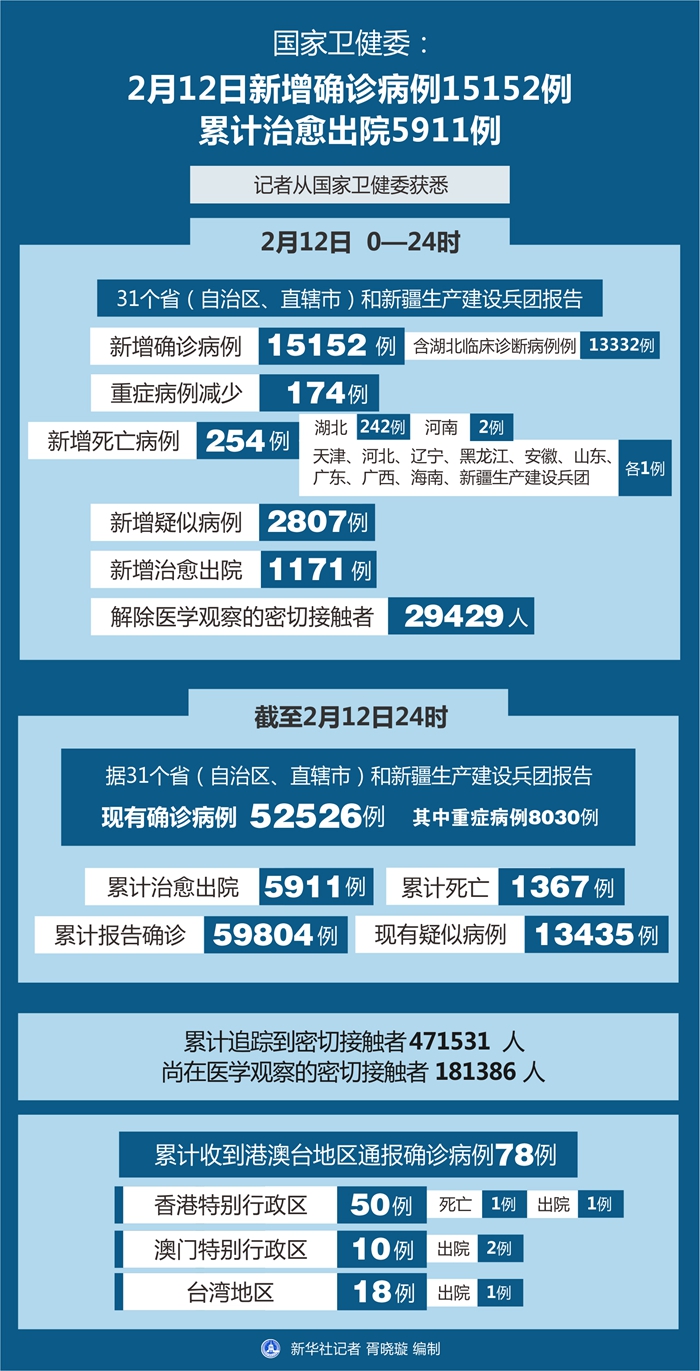 截至2月12日24時(shí),據(jù)31個(gè)?。ㄗ灾螀^(qū)、直轄市)和新疆生產(chǎn)建設(shè)兵團(tuán)報(bào)告,現(xiàn)有確診病例52526例(其中重癥病例8030例),累計(jì)治愈出院病例5911例,累計(jì)死亡病例1367例,累計(jì)報(bào)告確診病例59804例,現(xiàn)有疑似病例13435例。累計(jì)追蹤到密切接觸者471531人,尚在醫(yī)學(xué)觀察的密切接觸者181386人。