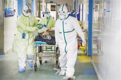 近日,武漢市蔡甸區(qū)人民醫(yī)院醫(yī)護(hù)人員在轉(zhuǎn)運(yùn)新冠肺炎重癥病人。陳 卓攝(影像中國(guó))