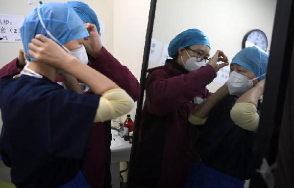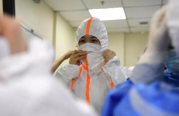 武漢協(xié)和醫(yī)院(西院),湘雅醫(yī)院的護(hù)士正在穿防護(hù)衣。經(jīng)濟(jì)日?qǐng)?bào)記者高興貴攝