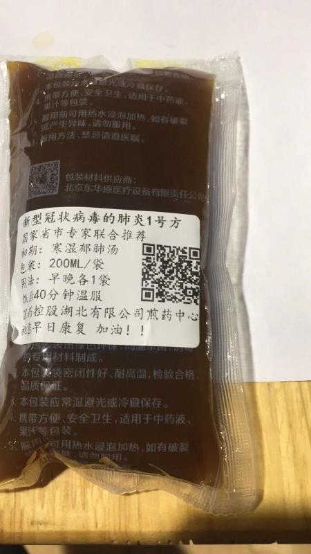 每天的診療,醫(yī)生給我開的藥有鹽酸阿比多爾片、鹽酸莫西沙星片、磷酸奧司他韋膠囊、蓮花清瘟膠囊和復(fù)方甲氧那明膠囊,以及袋裝的中藥肺炎1號方“寒濕郁肺湯”,每袋是200ml。護(hù)士會一次發(fā)給病人幾天的藥,吃完了再找他們要。有時候護(hù)士會提醒你吃藥,但是病人太多了忙不過來,我們病友間就要互相提醒。