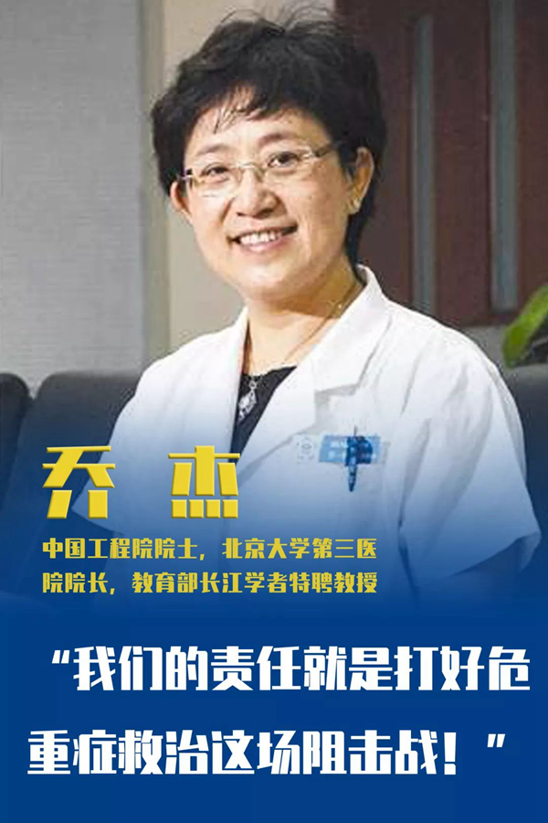 北京大學(xué)自創(chuàng)建以來,始終與國家和民族同呼吸共命運(yùn)。此次新冠狀病毒感染疫情嚴(yán)重,情況危急。北大迅速派出附屬醫(yī)院的多批醫(yī)療隊(duì)馳援武漢。截止到2月13日,北大援鄂抗疫國家醫(yī)療隊(duì)已累計(jì)收治危重癥患者200余例,而作為領(lǐng)導(dǎo)組組長,喬杰也已在武漢駐守12天。她協(xié)同各院領(lǐng)導(dǎo)和專家組成員,迅速梳理工作流程,從管理體制建立、到病房改造,再到人員培訓(xùn),儀器設(shè)備調(diào)配,每一細(xì)節(jié)嚴(yán)格把關(guān)。她帶領(lǐng)團(tuán)隊(duì)充分發(fā)揮北大醫(yī)學(xué)多學(xué)科合作優(yōu)勢(shì),為提高新冠肺炎危重患者治愈率,降低病亡率履行著應(yīng)盡的職責(zé)。