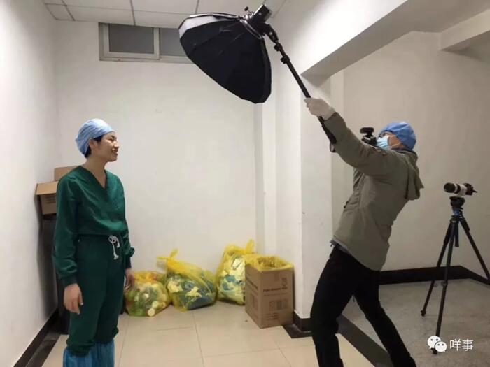 鐘銳鈞說,在拍攝的兩天內(nèi),他一直守在漢口醫(yī)院的隔離區(qū)外,等到醫(yī)護(hù)人員出門便走上前去,讓每個人只停留一分鐘,一手舉燈一手持相機(jī)完成拍攝。
