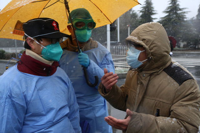 2月15日,武漢東西湖方艙醫(yī)院,武漢大學(xué)中南醫(yī)院副院長(zhǎng)、東西湖方艙醫(yī)院副院長(zhǎng)李志強(qiáng)(左一)在雪中等待為治愈患者發(fā)放出院證明。趙迪/攝