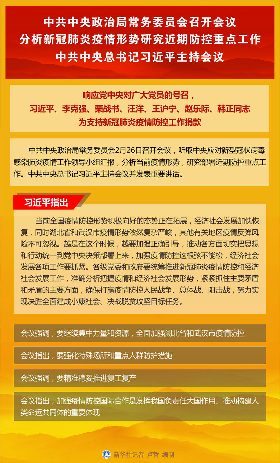 新華社北京2月26日電 中共中央政治局常務(wù)委員會(huì)2月26日召開會(huì)議,聽(tīng)取中央應(yīng)對(duì)新型冠狀病毒感染肺炎疫情工作領(lǐng)導(dǎo)小組匯報(bào),分析當(dāng)前疫情形勢(shì),研究部署近期防控重點(diǎn)工作。中共中央總書記習(xí)近平主持會(huì)議并發(fā)表重要講話。