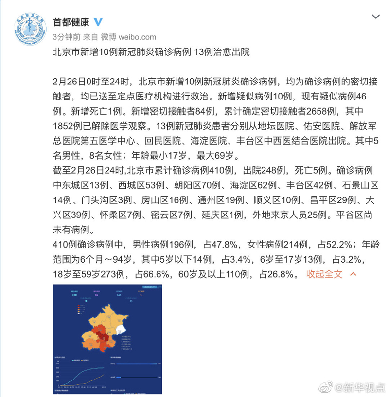 2月26日0時(shí)至24時(shí),北京市新增10例新冠肺炎確診病例,均為確診病例的密切接觸者,均已送至定點(diǎn)醫(yī)療機(jī)構(gòu)進(jìn)行救治。新增疑似病例10例,現(xiàn)有疑似病例46例。新增死亡1例。新增密切接觸者84例,累計(jì)確定密切接觸者2658例,其中1852例已解除醫(yī)學(xué)觀察。13例新冠肺炎患者分別從地壇醫(yī)院、佑安醫(yī)院、解放軍總醫(yī)院第五醫(yī)學(xué)中心、回民醫(yī)院、海淀醫(yī)院、豐臺區(qū)中西醫(yī)結(jié)合醫(yī)院出院。其中5名男性,8名女性;年齡最小17歲,最大69歲。