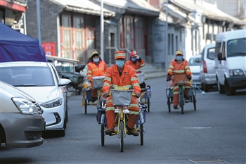 3月11日,前門街道,環(huán)衛(wèi)工們走街串巷打掃衛(wèi)生。