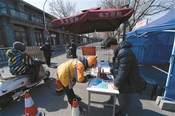“我們從大年三十就開始排班了。我是從正月初三開始進(jìn)社區(qū)做入戶排查,現(xiàn)在和另外兩名志愿者一起負(fù)責(zé)這個路口,從早上九點到晚上九點不間斷。”來自前門街道辦事處政務(wù)服務(wù)中心的周偉介紹說。
