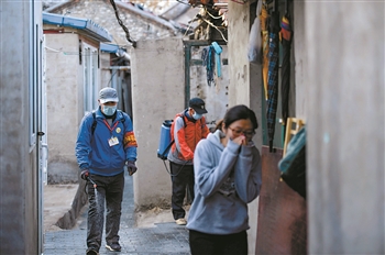 3月12日,任國慶(圖左)和搭檔來到前門大江社區(qū)一院落噴灑消毒液。