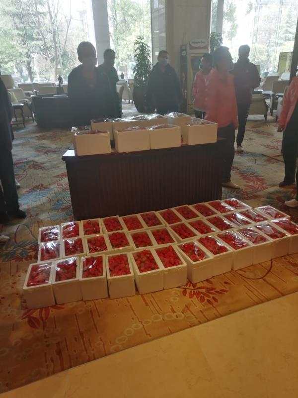 據(jù)前來送草莓的康復(fù)患者稱,這些草莓是江岸方艙醫(yī)院64名病友花費了1.6萬元購買送給河北的醫(yī)護人員。為了保證草莓的新鮮,武漢當?shù)剞r(nóng)民從凌晨3點就開始采摘?!斑@是我們的一點心意,如果不是你們的幫助,單靠武漢的醫(yī)務(wù)人員確實是挺不住的,很感謝你們從全國各地來幫助我們,這次疫情來的很突然,我的母親也因病毒感染去世。小家的母親走了,但是你們卻拯救了武漢這個大家。非常感謝你們。希望大家把這點心意和問候帶回河北,同時也希望大家一路平安,感謝你們對我們武漢的很大幫助。謝謝大家!”