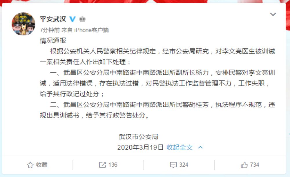 武漢市公安局:撤銷(xiāo)對(duì)李文亮醫(yī)生的訓(xùn)誡書(shū)并致歉