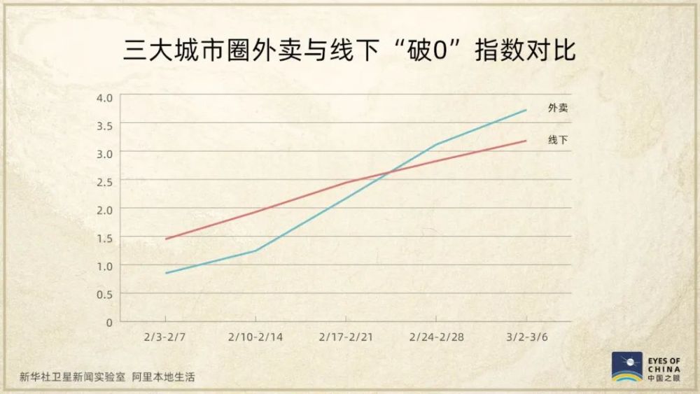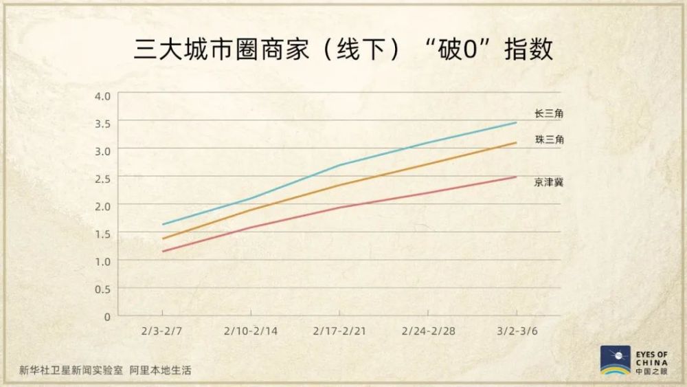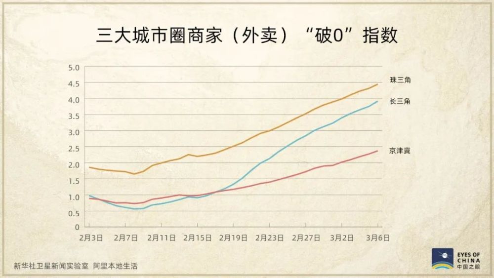 “破0”指數(shù),是根據(jù)商家恢復營業(yè)獲得首筆收入、復工后的持續(xù)營業(yè)時間等計算得出,這兩張圖呈現(xiàn)出,在三大城市圈,復工復產(chǎn)并獲得收入的商家不斷增多。