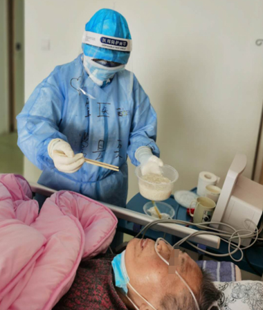 我所在的湖北婦幼保健院光谷院區(qū)感染二科是重癥科室,病人基本都是生活不能自理的老奶奶、老爺爺。除了日常的護(hù)理工作---輸液、動(dòng)靜脈采血、插胃管、導(dǎo)尿管、檢測(cè)呼吸機(jī)、搶救病人、病房的洗消、垃圾的處理外,還要喂飯、喂藥,換尿不濕。因?yàn)檎Z言不通(老人家說武漢方言),還要連說帶比劃,半天才能搞明白爺爺奶奶們想要表達(dá)的意思。一個(gè)班下來,渾身都是汗快要累癱了,但是耳邊老爺爺老奶奶的話語,“孩子,謝謝你”,那時(shí)候我的心里倍感欣慰,感覺渾身都是勁。