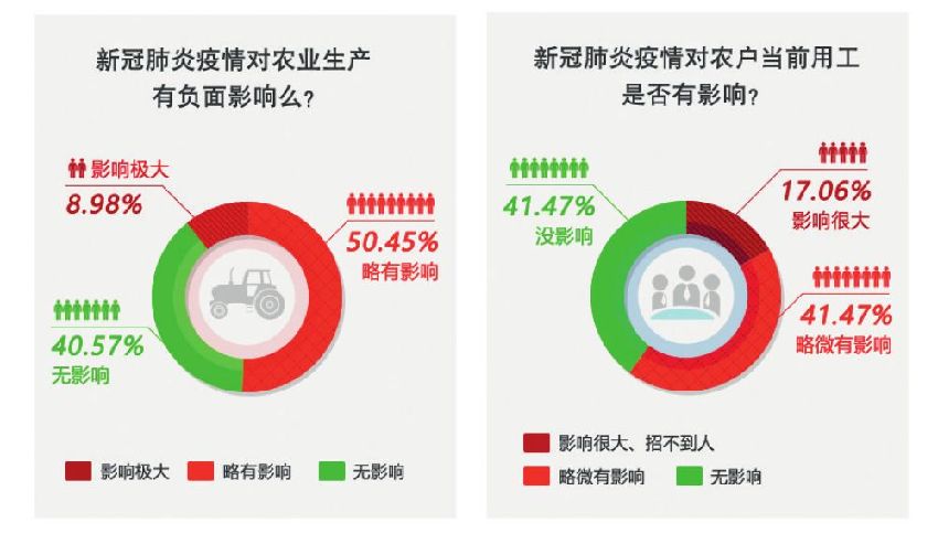 557份有效問卷數(shù)據(jù)顯示,8.98%的農(nóng)戶認(rèn)為疫情對(duì)農(nóng)業(yè)生產(chǎn)負(fù)面影響極大,50.45%的農(nóng)戶認(rèn)為略有影響。在疫情對(duì)用工影響上,17.06%的農(nóng)戶反映影響大、招不到人,41.47%的農(nóng)戶認(rèn)為略微有影響。(見圖1)