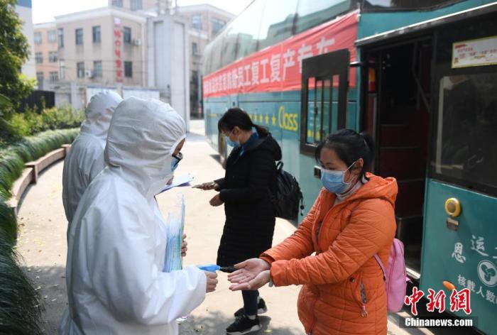 3月19日,湖北恩施復(fù)工人員到達(dá)杭州洲際食品有限公司后進(jìn)行防疫消毒。當(dāng)日,來自湖北省恩施州的首批146名赴杭州復(fù)工人員抵達(dá)浙江杭州。 中新社記者 王剛 攝