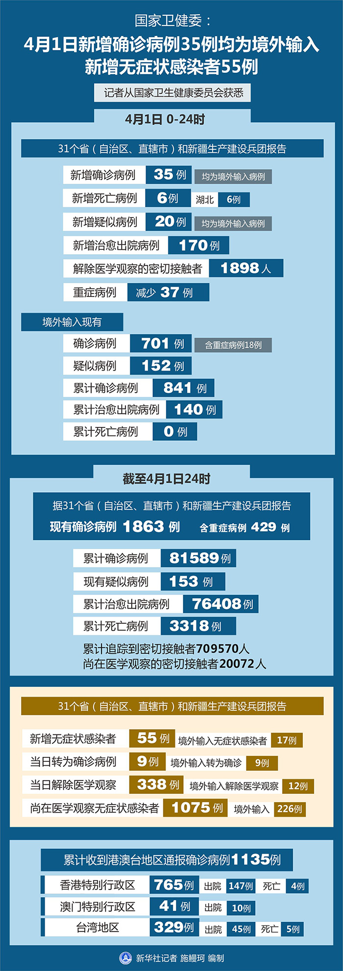 截至4月1日24時,據(jù)31個?。ㄗ灾螀^(qū)、直轄市)和新疆生產(chǎn)建設(shè)兵團(tuán)報(bào)告,現(xiàn)有確診病例1863例(含重癥病例429例),現(xiàn)有疑似病例153例。累計(jì)確診病例81589例,累計(jì)治愈出院病例76408例,累計(jì)死亡病例3318例,累計(jì)追蹤到密切接觸者709570人,尚在醫(yī)學(xué)觀察的密切接觸者20072人。
