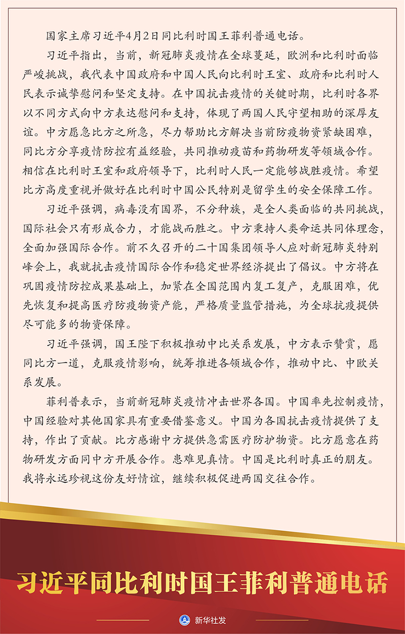 習(xí)近平指出,當(dāng)前,新冠肺炎疫情在全球蔓延,歐洲和比利時面臨嚴峻挑戰(zhàn),我代表中國政府和中國人民向比利時王室、政府和比利時人民表示誠摯慰問和堅定支持。在中國抗擊疫情的關(guān)鍵時期,比利時各界以不同方式向中方表達慰問和支持,體現(xiàn)了兩國人民守望相助的深厚友誼。中方愿急比方之所急,盡力幫助比方解決當(dāng)前防疫物資緊缺困難,同比方分享疫情防控有益經(jīng)驗,共同推動疫苗和藥物研發(fā)等領(lǐng)域合作。相信在比利時王室和政府領(lǐng)導(dǎo)下,比利時人民一定能夠戰(zhàn)勝疫情。希望比方高度重視并做好在比利時中國公民特別是留學(xué)生的安全保障工作。