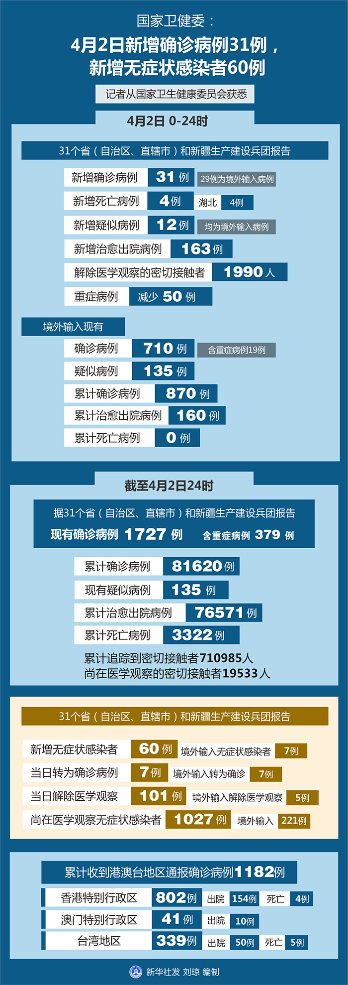 截至4月2日24時,據(jù)31個?。ㄗ灾螀^(qū)、直轄市)和新疆生產(chǎn)建設(shè)兵團報告,現(xiàn)有確診病例1727例(其中重癥病例379例),累計治愈出院病例76571例,累計死亡病例3322例,累計報告確診病例81620例,現(xiàn)有疑似病例135例。累計追蹤到密切接觸者710985人,尚在醫(yī)學(xué)觀察的密切接觸者19533人。